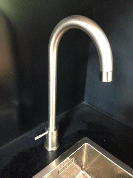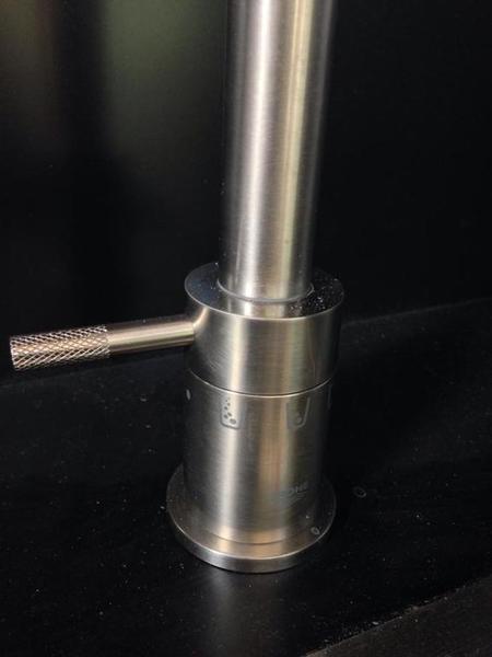 System ist ebenso einfach zu bedienen wie eine übliche Küchenarmatur. Die Wassertemperatur und Durchflussmenge steuern Sie ganz leicht mit dem rechten Hebel, während Sie an dem Knopf mit dem